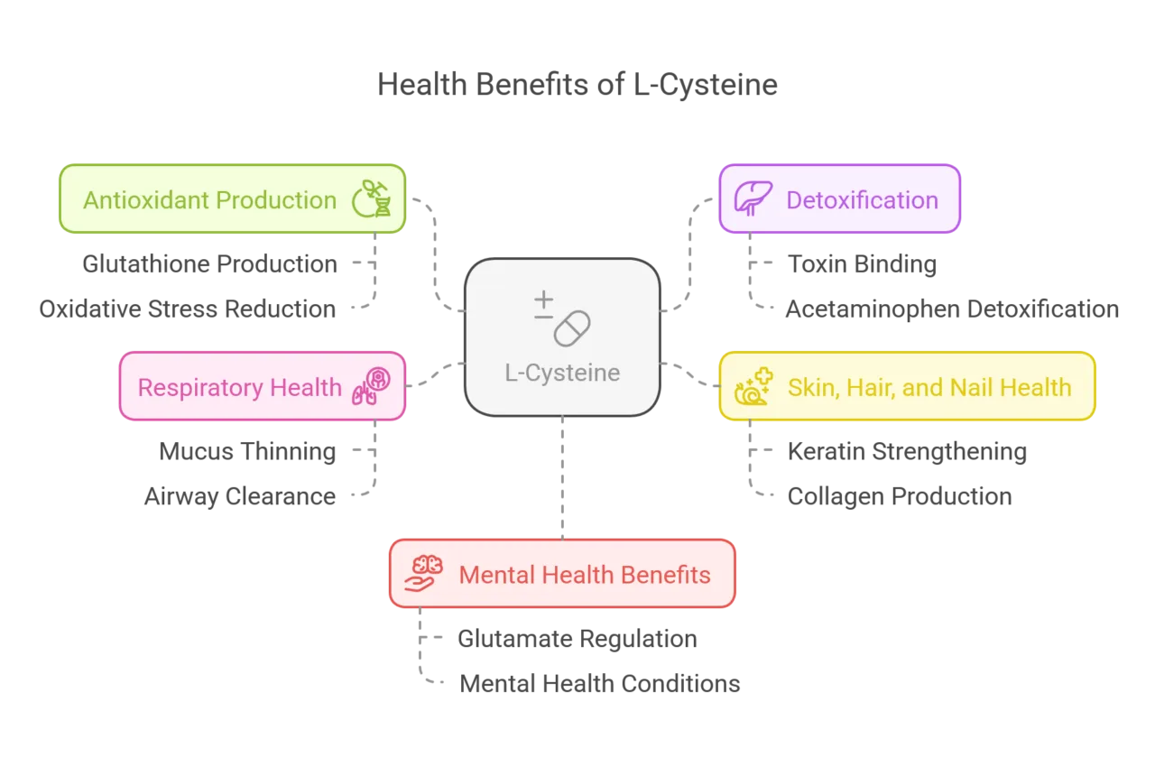 L-cysteine has many health benefits. This is mainly because it helps produce glutathione. It also plays a key part in protecting the body from damage caused by free radicals.
